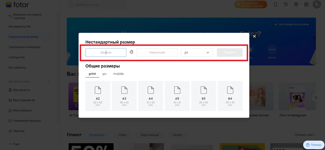 Учтите, что все шаблоны для соцсетей ориентированы на западные площадки. Если вам нужно сделать графику для ВКонтакте или Дзен, придется создавать дизайн с нуля. Кликните по кнопке «Нестандартный размер» в правом верхнем углу интерфейса, чтобы настроить макет вручную.
