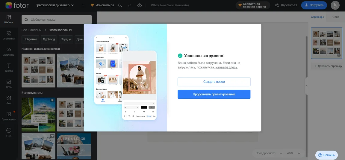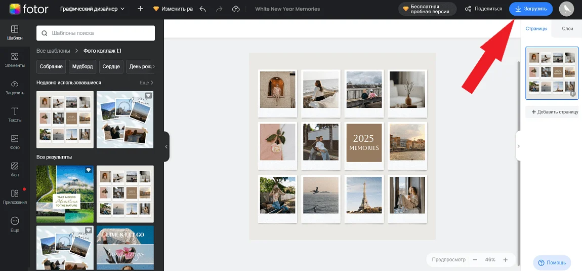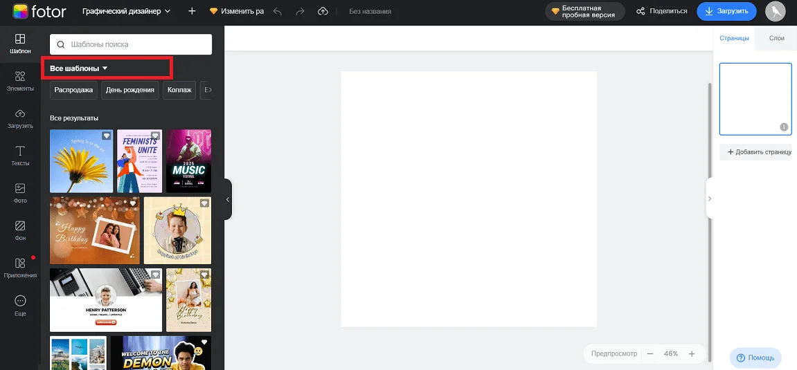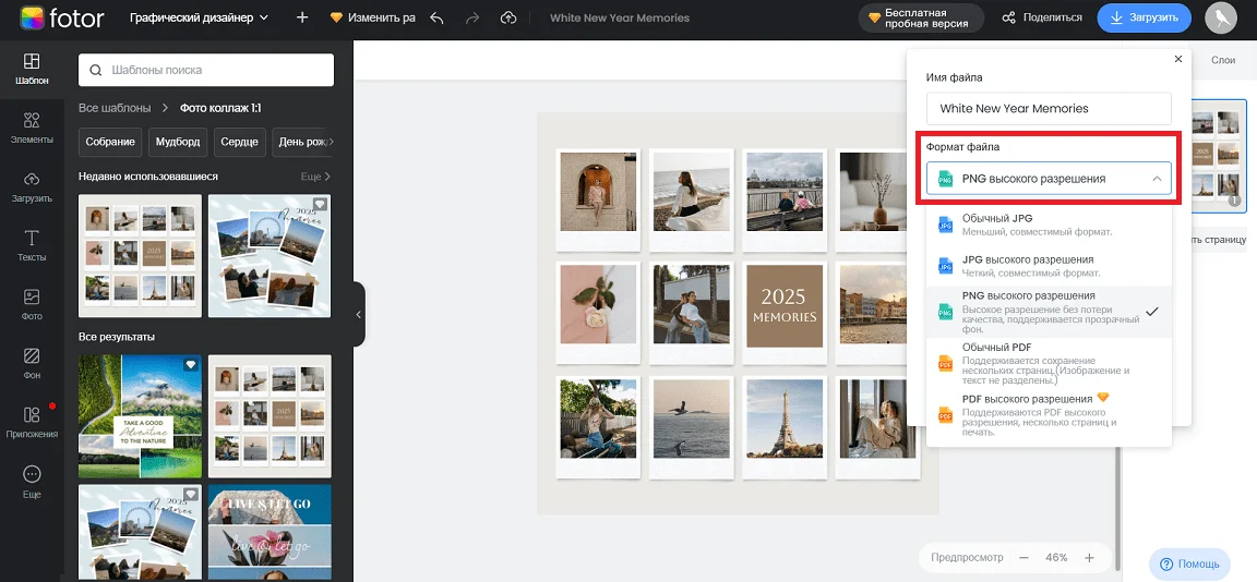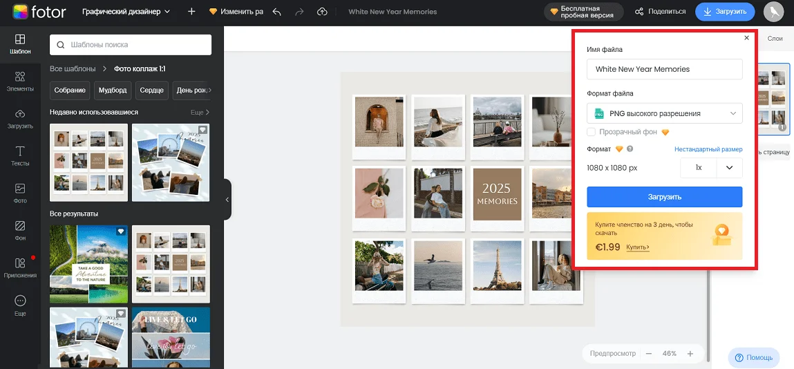 Учтите, что если вы используете премиальные шаблоны в бесплатной версии, дизайн будет с водяными знаками. Чтобы убрать их или скачать изображение с прозрачным фоном, придется оформлять подписку Fotor Pro. Как вариант — подключить платный тариф на 3 дня. Бесплатные шаблоны можно загружать из редактора без водяных знаков.