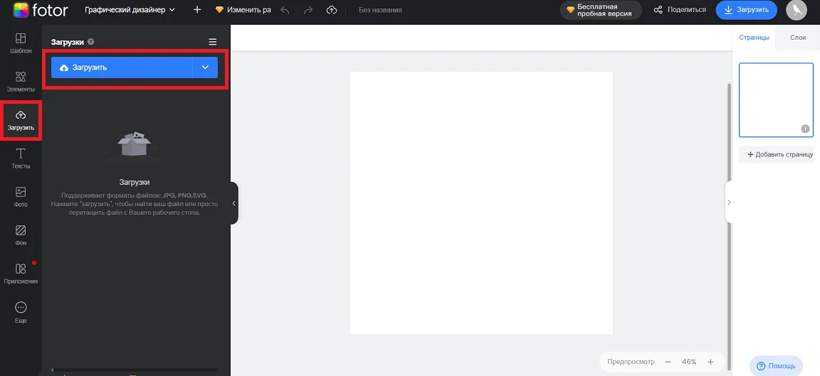 Раздел «Загрузить» предназначен для загрузки собственных файлов в редактор. Fotor поддерживает форматы PNG, JPG и SVG и позволяет загружать графику с телефона, компьютера или хранилища Dropbox.