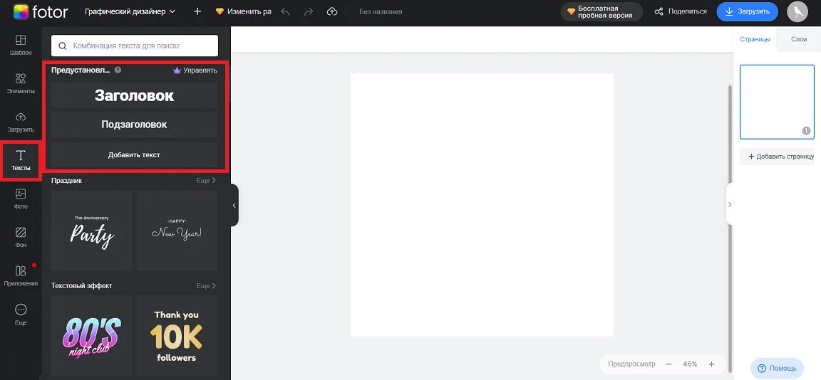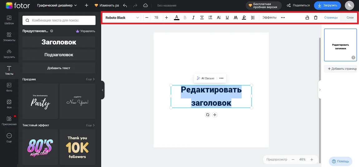 В разделе «Тексты» собраны шаблоны подписей для дизайнов, а также есть инструменты для создания и редактирования своих подписей. На каждый макет можно добавить заголовок, подзаголовок и основной текст, а затем отредактировать их под свой проект через контекстное меню в верхней части интерфейса.