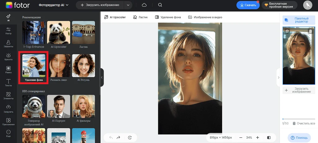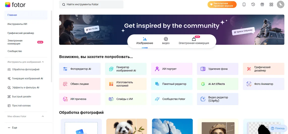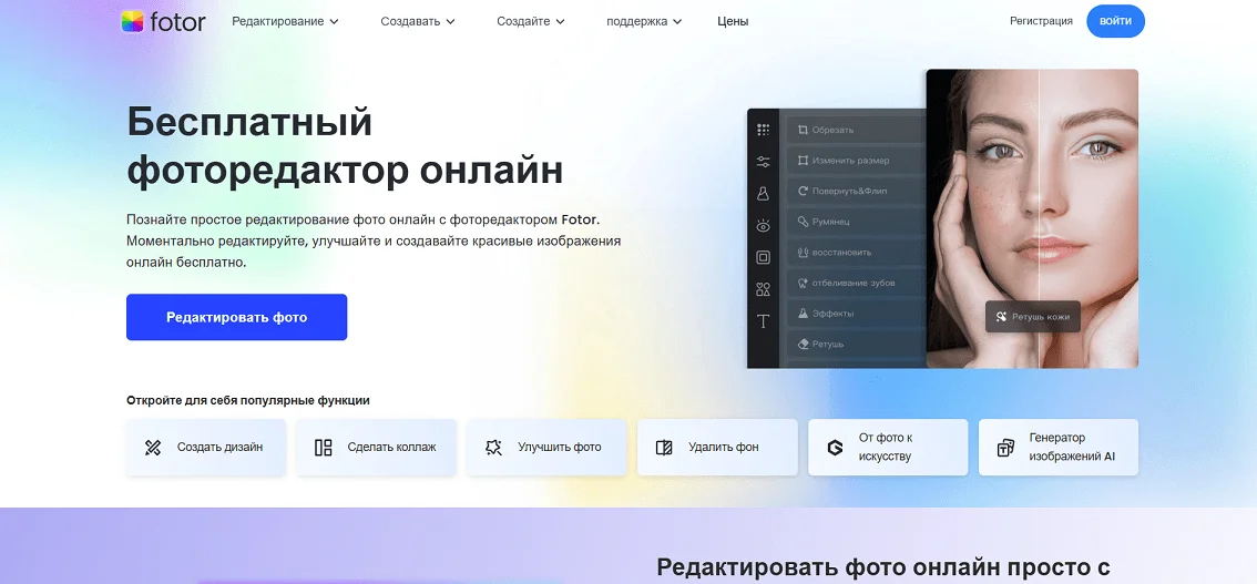 Fotor — это онлайн-редактор для профессиональной обработки фото с широким набором AI-инструментов. Сервис позволяет улучшать качество изображений, создавать графику для соцсетей и рекламы, делать коллажи, генерировать изображения по промптам. Все инструменты можно попробовать бесплатно, а благодаря простому и понятному интерфейсу работать в редакторе смогут даже новички.