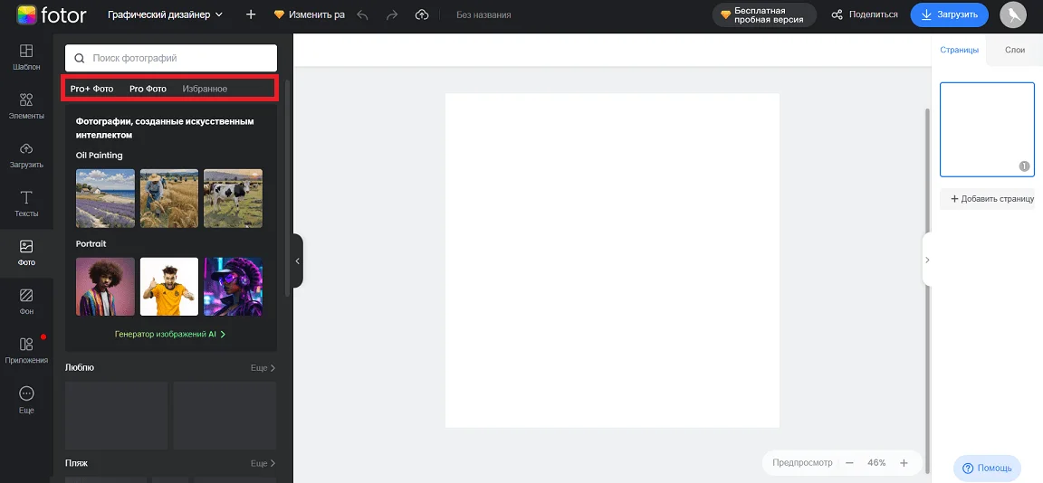В разделе «Фото» находится фотосток Fotor. Если вы видите превью картинки, значит ее можно использовать бесплатно. Платные изображения для тарифов Pro и Pro+ собраны в соответствующих подразделах.