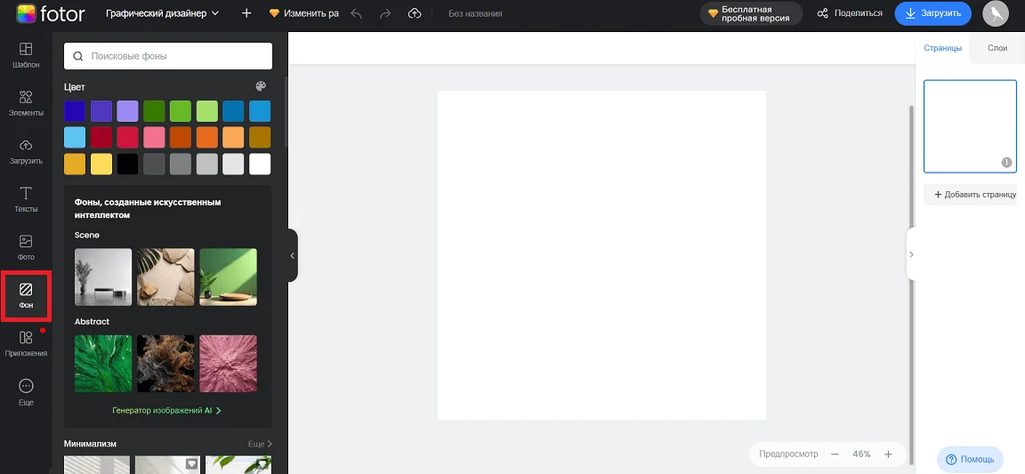 В разделе «Фон» можно выбрать фоновое изображение или настроить цвет заливки для дизайна. Бесплатные фоны встанут на макет по клику без каких-либо ограничений, а платные — только с водяным знаком Fotor.