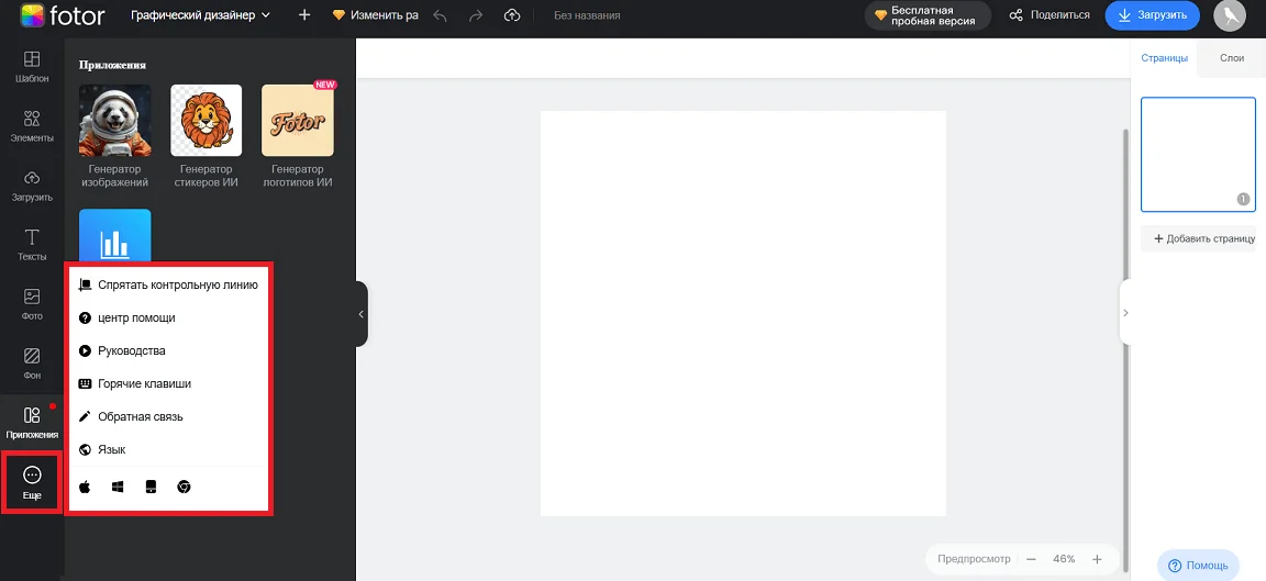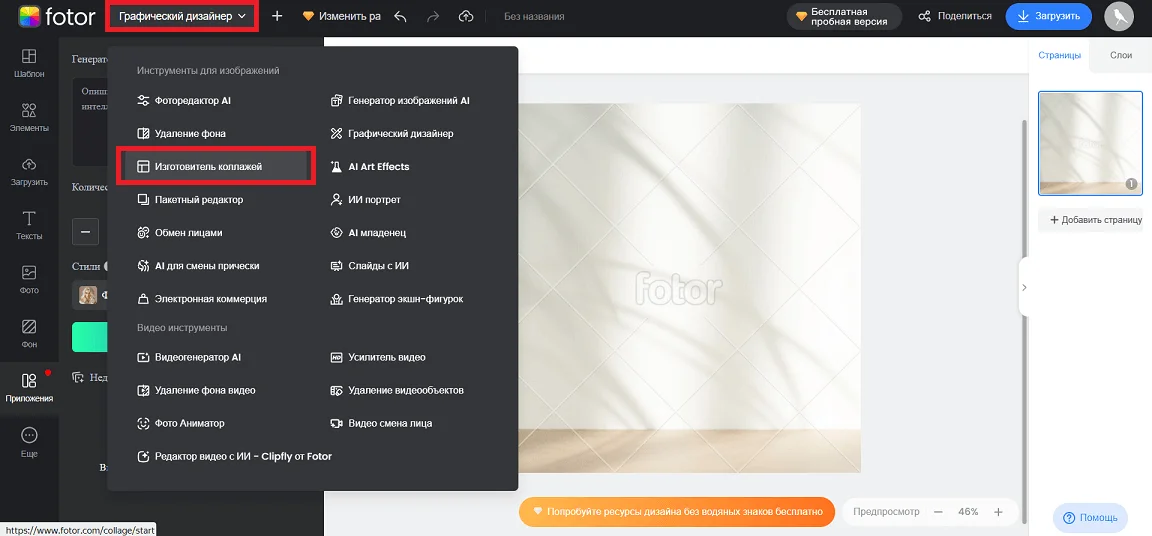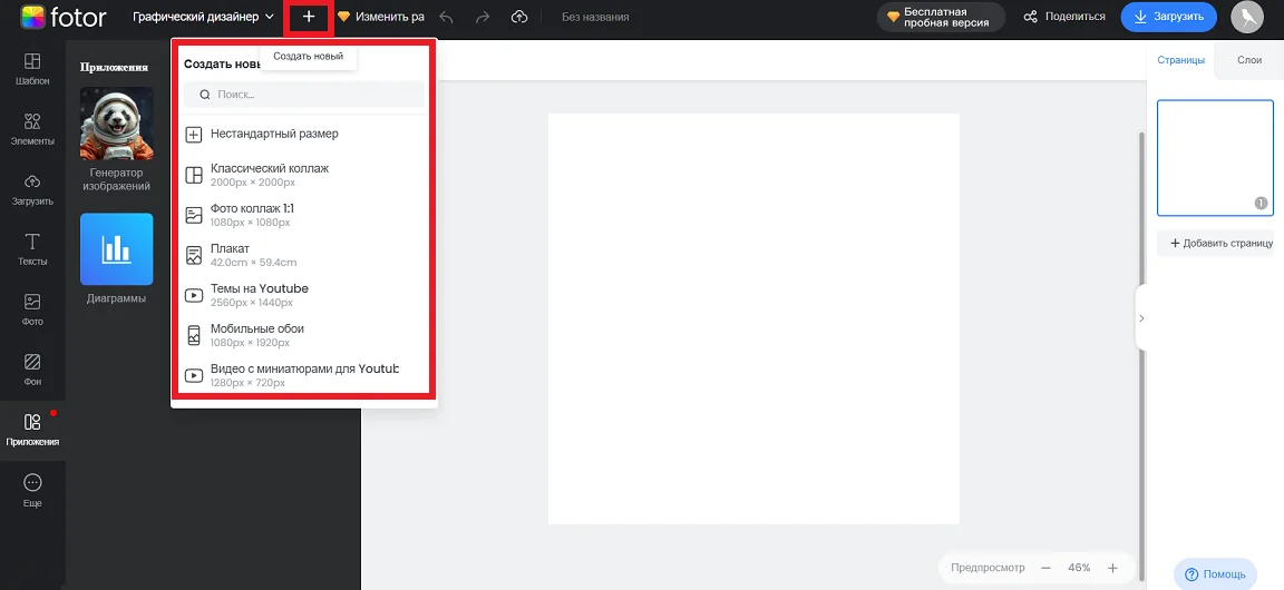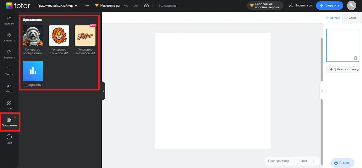 В разделе «Приложения» Fotor находится часть ИИ-инструментов: генератор изображений, стикеров и логотипов, а также функция для создания диаграмм.