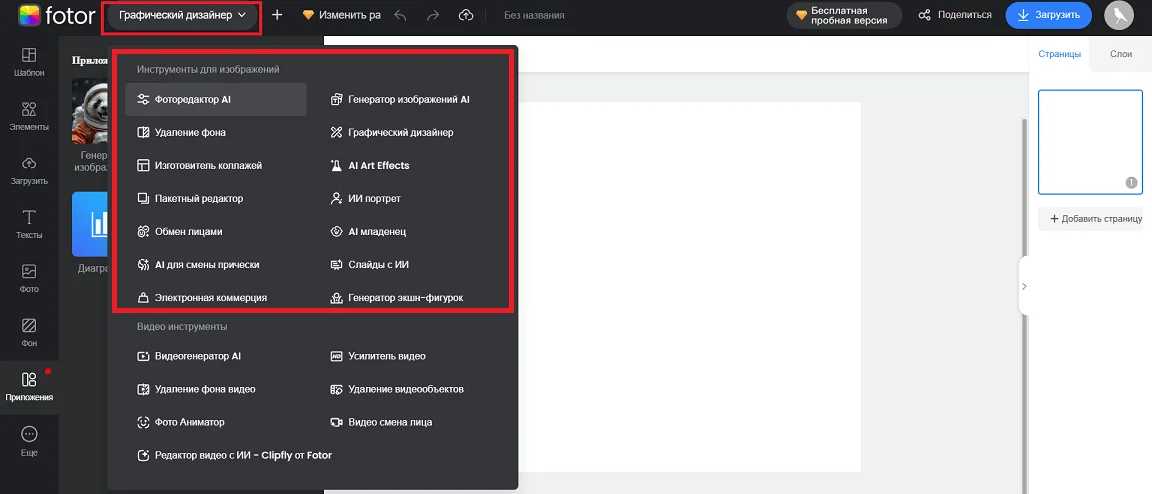 Все AI-функции фоторедактора Fotor скрыты в контекстном меню в левой верхней части интерфейса. Каждый инструмент открывается в отдельной вкладке. Принцип работы такой: нажимаете, например, на «Удаление фона», в новой вкладке загружаете свое фото, удаляете фон, а затем отправляете картинку в выбранный дизайн. Покажем дальше, как это сделать.