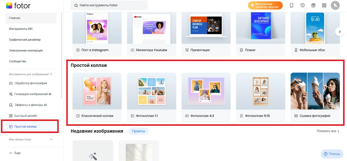 В фоторедакторе Fotor можно создавать простые и сложные коллажи. Шаблоны простых коллажей вы найдете в одноименном разделе на дашборде. Просто кликаете по макету, открываете его в редакторе и меняете элементы дизайна по своему усмотрению.