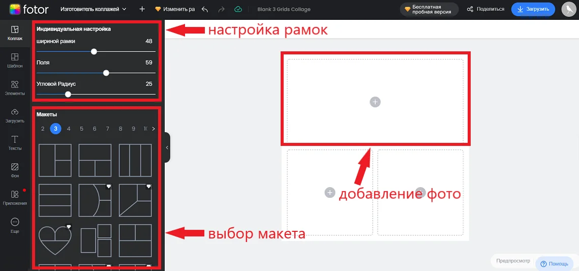 Сложные коллажи вы создаете с нуля: выбираете макет с нужным количеством фото, настраиваете рамки, добавляете фотографии, по желанию — меняете фон, дополняете дизайн подписями. Все интуитивно понятно.