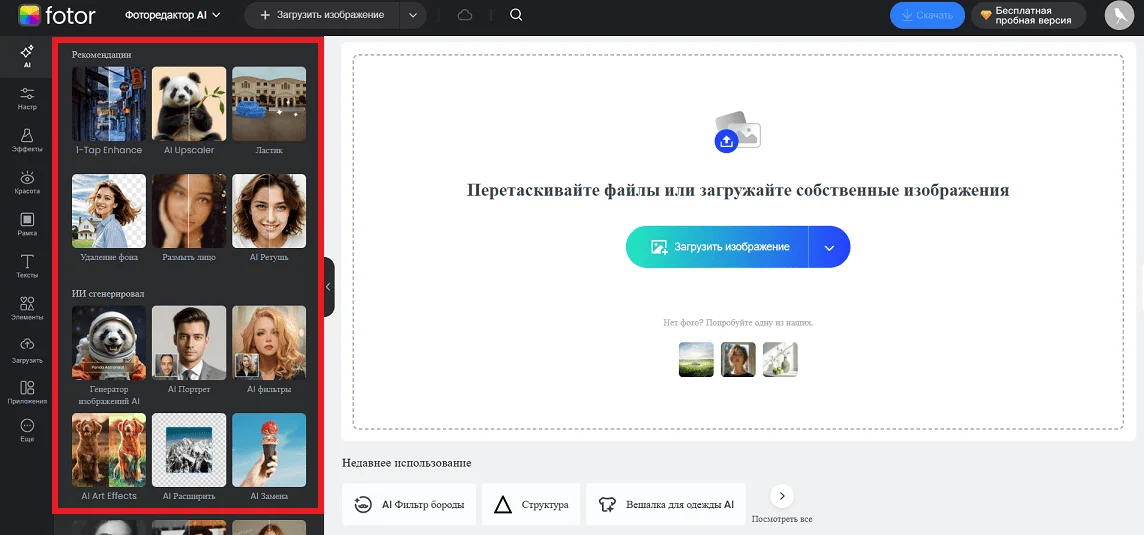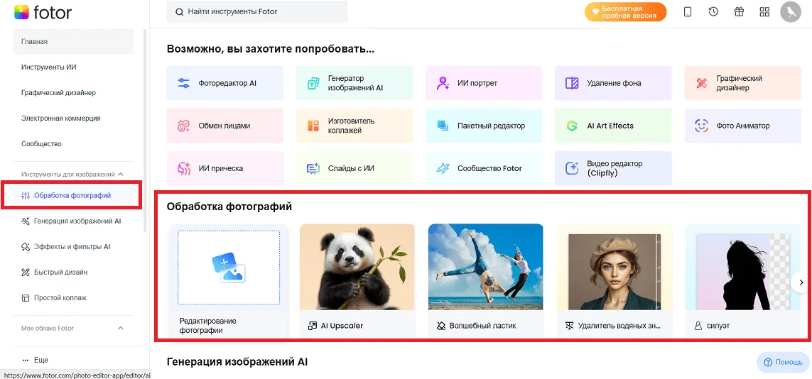 Для комплексной обработки фото нужно перейти в раздел «Фоторедактор AI» через контекстное меню или по ссылке.