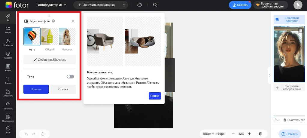 Сервис предложит три варианта редактирования: Авто, Общий и Человек. Посмотрите мини-инструкцию и кликните по каждому варианту, чтобы понять, какой результат вам больше подходит. Fotor сохранит изменения, только если нажмете на кнопку «Принять».
