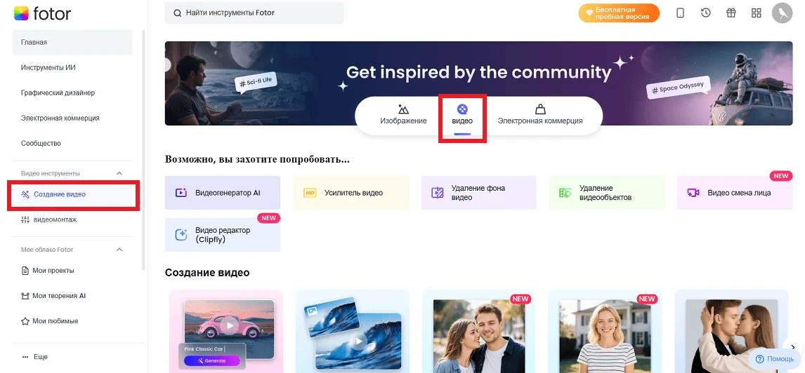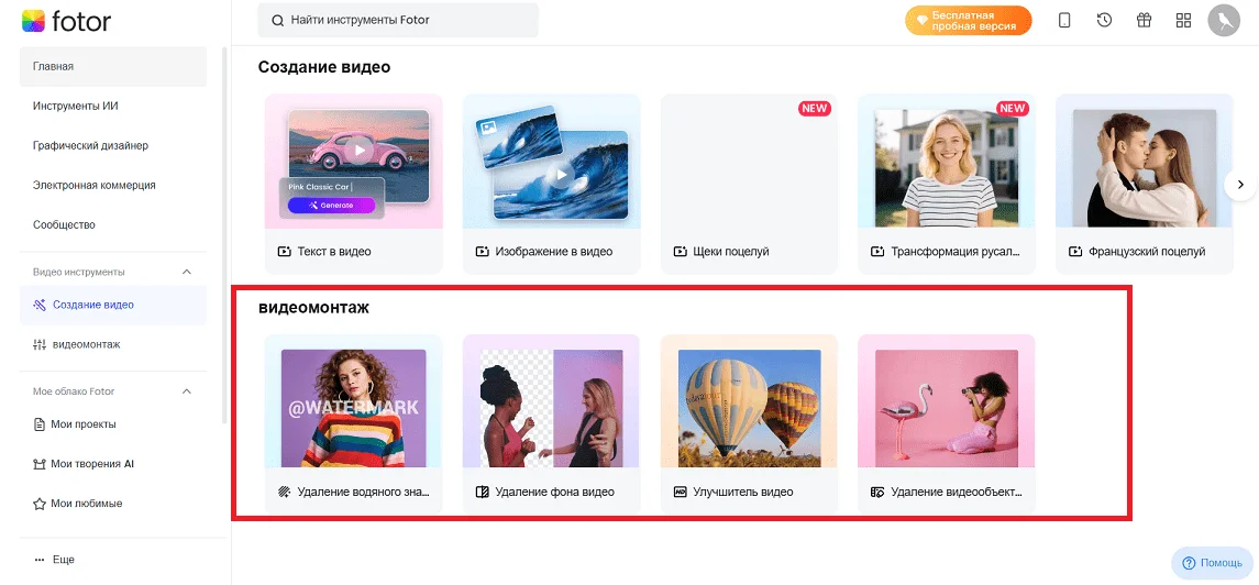 В фоторедакторе Fotor есть несколько инструментов для создания и улучшения видео. Они находятся в разделе «Создание видео» на дашборде.