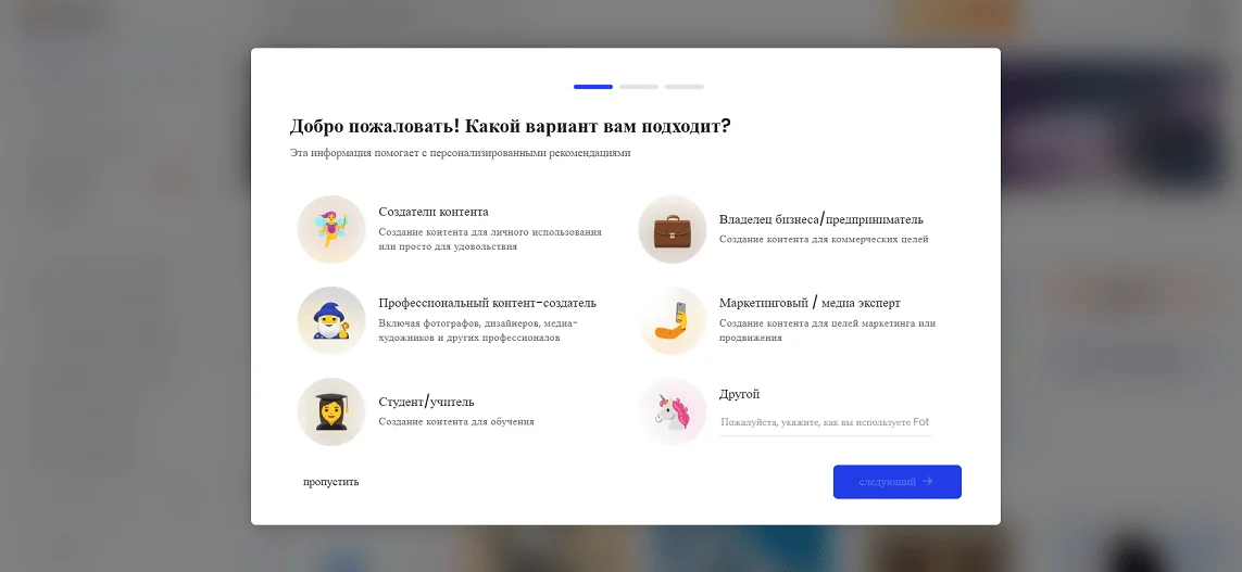 После авторизации сервис просит заполнить короткую анкету: с какими целями вы планируете использовать фоторедактор. Анкету можно пропустить, но если все же заполните ее, Fotor слегка адаптирует интерфейс под вас.