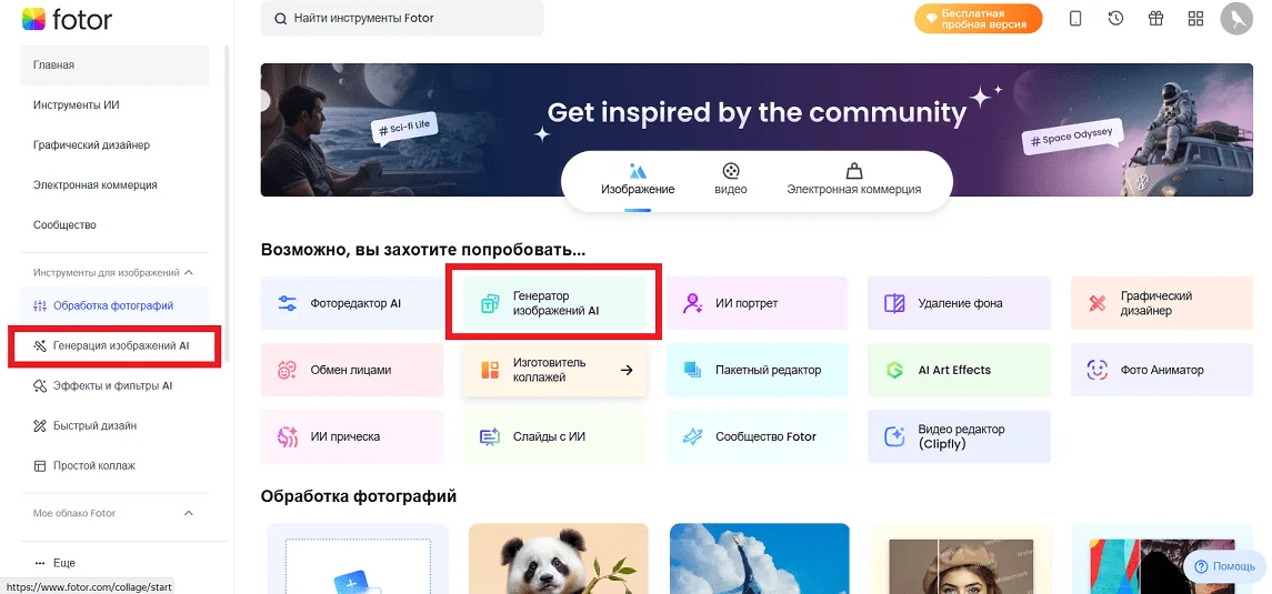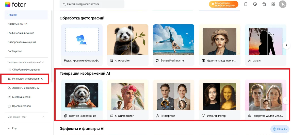 Все инструменты для генерации изображений с помощью нейросетей Fotor находятся в разделе «Генератор изображений AI».