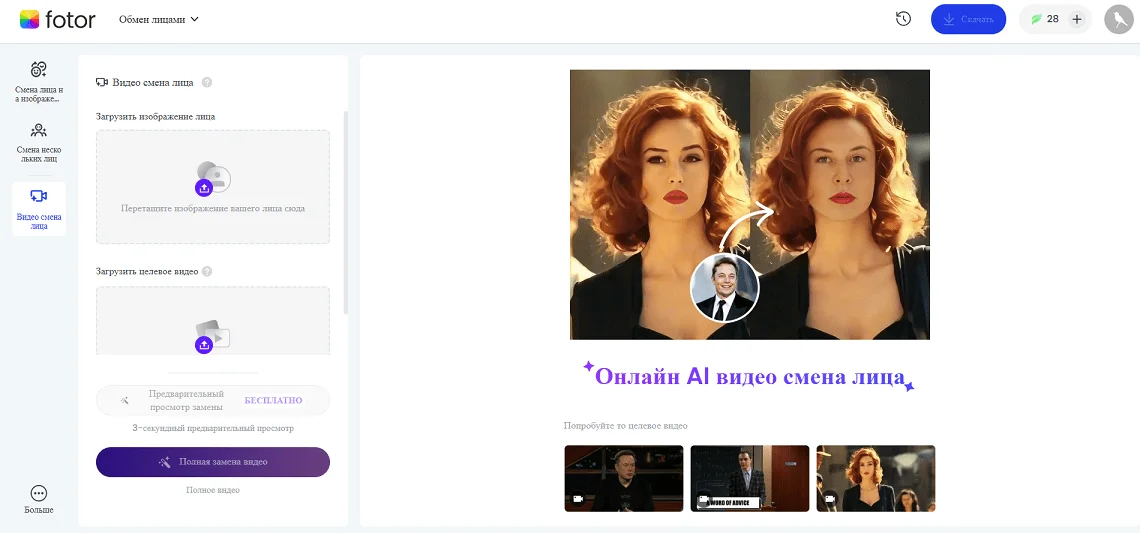 Некоторые AI-инструменты позволяют трансформировать как фотографии, так и видеофайлы. Например, перед тем как заменить лицо с помощью нейросети Fotor, можно выбрать в настройках тип файла — фото или видео. От типа файла зависит стоимость обработки запроса — на трансформацию видео обычно требуется больше кредитов.