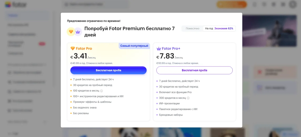 Платная подписка Fotor Pro дает доступ к продвинутым инструментам редактирования и AI-функциям, премиум-шаблонам и эффектам, разрешает скачивать видео в HD и картинки с прозрачным фоном без водяных знаков. Подписка привязывается к аккаунту — оформляете один раз и используете все функции сервиса на любых устройствах.