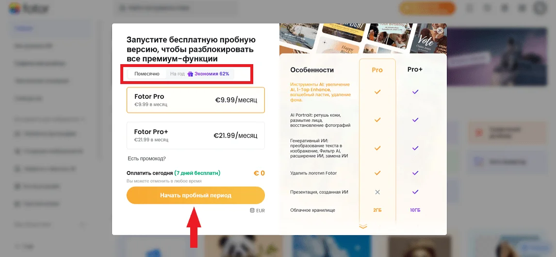 После анкеты Fotor предлагает оформить бесплатную пробную версию Fotor Pro, которая открывает доступ ко всем инструментам фоторедактора. Можно пропустить этот шаг, просто кликнув по любой зоне интерфейса.