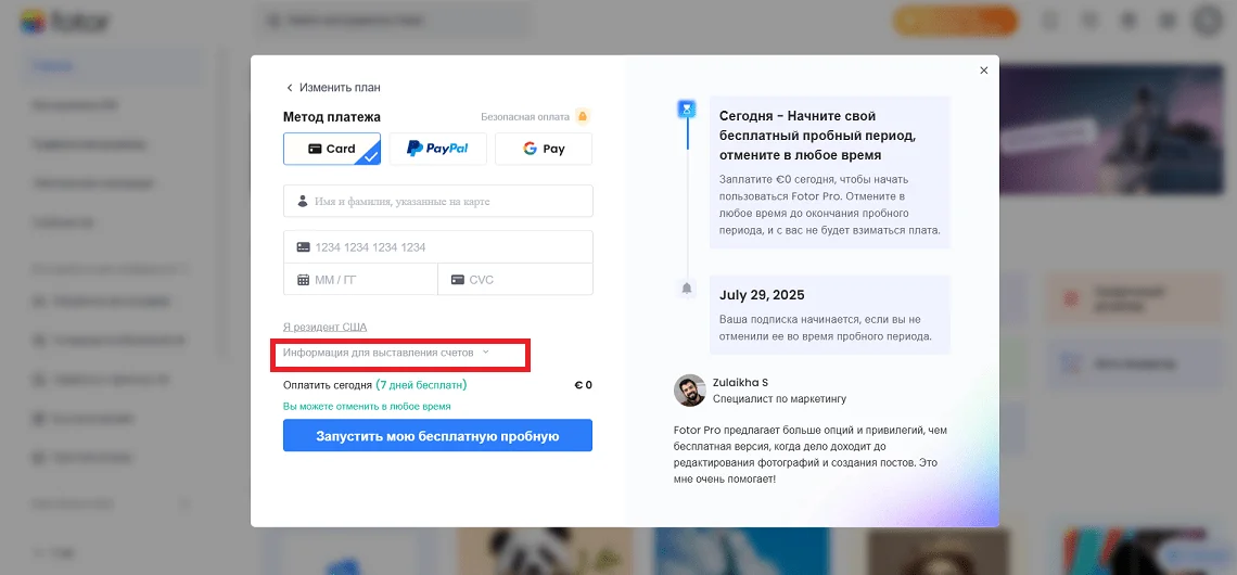 Бесплатная пробная версия будет доступна 7 дней после привязки реквизитов карты. Ее можно в любой момент отключить в настройках профиля. Если захотите пользоваться платной версией, но оплата не пройдет, придется искать зарубежную карту.