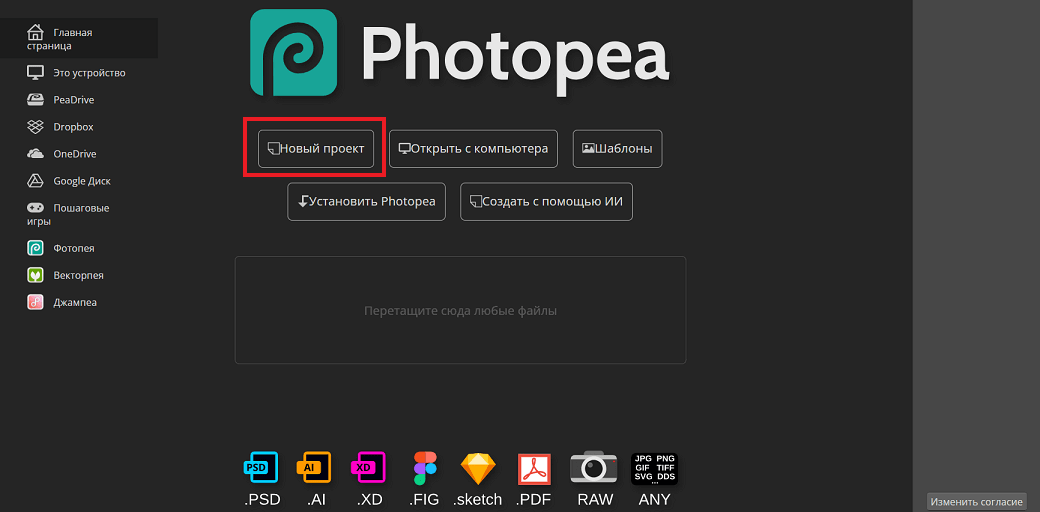 Photopea не требует регистрации перед началом работы с графикой. Просто переходите на официальный сайт, создаете новый проект или загружаете фото в редактор. С одной стороны, удобно и просто, а с другой — можно потерять несохраненный результат, если случайно перезагрузите страницу.