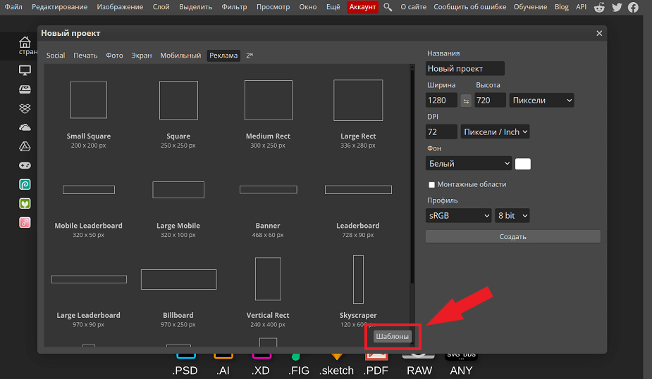Если нужно подготовить графику для соцсетей, рекламные баннеры или визуал для печати, лучше создать новый проект. В библиотеке редактора Photopea есть десятки шаблонов. Просто кликнете по кнопке «Новый проект» и выберите холст с нужным соотношением сторон.