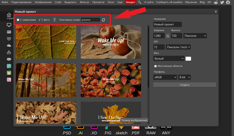 У поиска по шаблонам есть дополнительные инструменты сортировки. Например, можно отобрать макеты с фоном определенного цвета и надписями или с тематическими изображениями. Для этого проставьте чекбоксы и используйте поиск по ключевым словам. Писать лучше на английском — Photopea не переваривает пользователей из России.