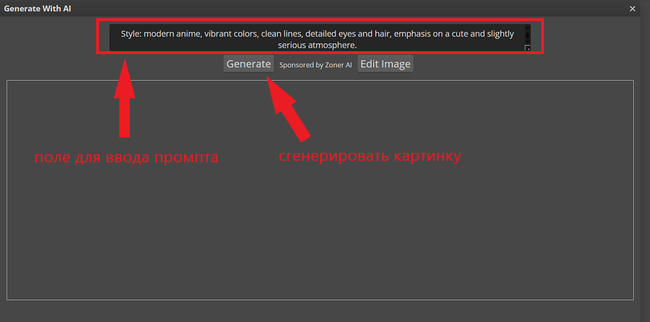 Нейросеть Photopea выдаст результат в том же окне через несколько секунд. Если результат не устроит, можно дополнить текст промпта и запустить повторную генерацию. А если картинка подходит, нажмите на кнопку «Edit Image», чтобы открыть ее в редакторе.