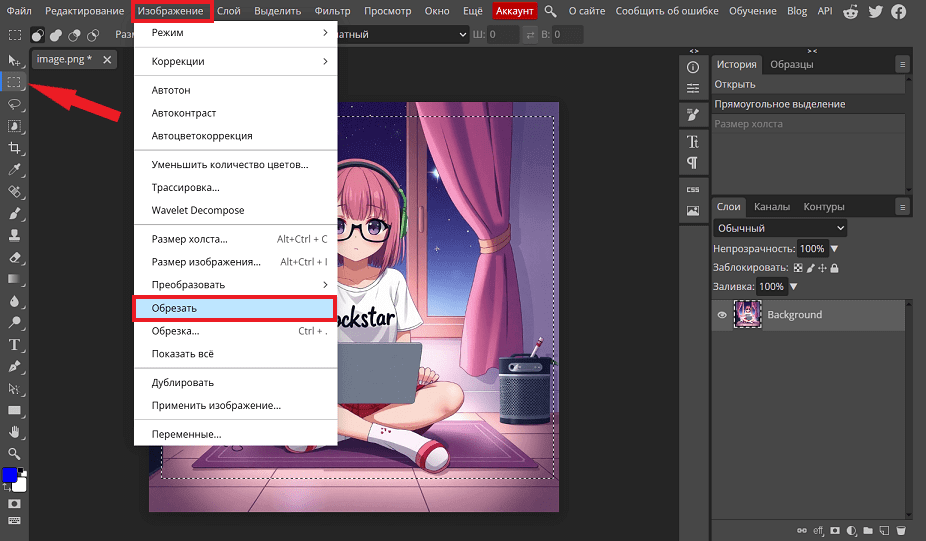 Для обрезки изображения используйте инструмент «Прямоугольное выделение». Выделите область на картинке, а затем нажмите в контекстном меню на «Изображение – Обрезать».