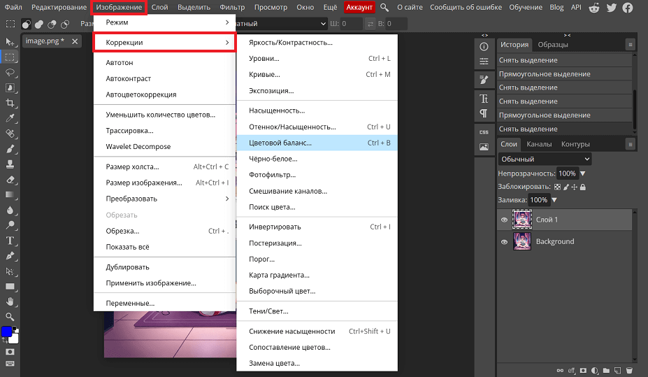 В Photopea есть впечатляющий набор инструментов цветокоррекции — от стандартной настройки яркости, контраста и насыщенности до смешивания каналов и постеризации. Все находятся во вкладке «Изображение – Коррекции».