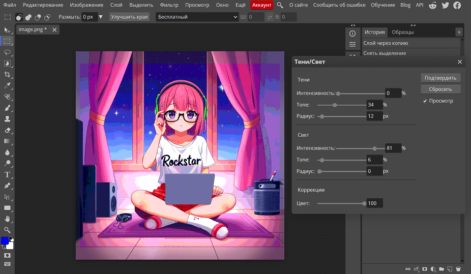 Photopea сразу показывает результат цветокоррекции в режиме предпросмотра. Если вам нравится обработка, нажмите на кнопку «Подтвердить» в контекстном меню. А если нужно вернуться к исходному файлу, просто отмените последние действия с помощью горячих клавиш — Ctrl + Z.
