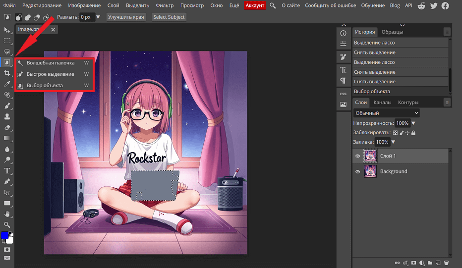 Для удаления фона и объектов в Photopea можно использовать несколько инструментов выделения: обычное, многоугольное и магнитное лассо, волшебную палочку, быстрое выделение и выделение объектов. Все они находятся в соответствующих разделах контекстного меню слева.