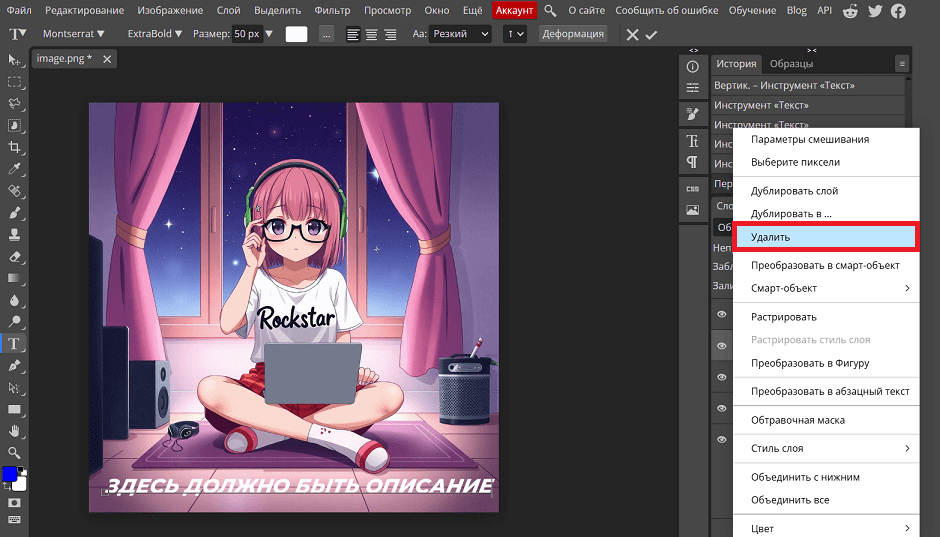 Для перемещения надписи удерживайте ее левой кнопкой мыши и двигайте по холсту. А если нужно удалить текст, просто выделите его и нажмите Delete. Или удалите слой с текстом в контекстном меню справа — нажмите на него правой кнопкой мыши и выберите «Удалить».