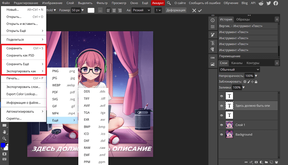 В редакторе Photopea все макеты можно сохранять как PSD-файлы или экспортировать в один из популярных форматов: PNG, JPG, GIF, MP4 и другие. Инструменты сохранения и экспорта находятся в разделе «Файл» верхнего контекстного меню.