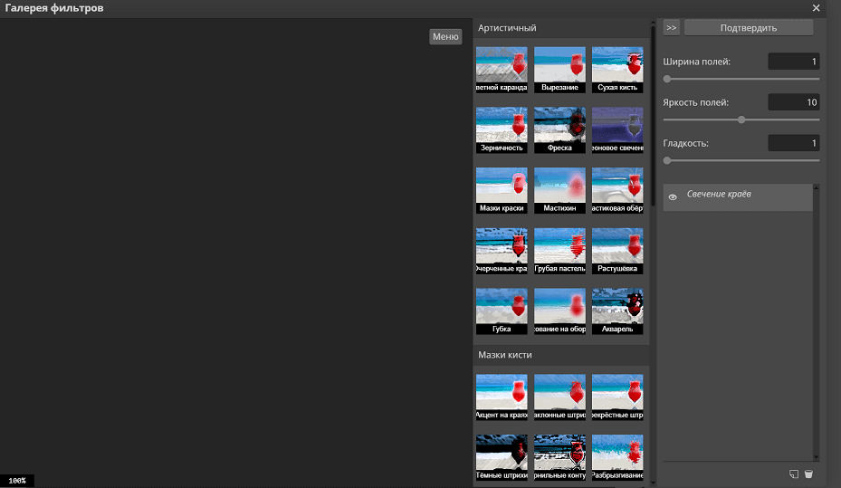 Все фильтры находятся в одноименном разделе контекстного меню. Здесь можно найти стандартный набор — находится во вкладке «Галерея фильтров»; а также инструменты для профессиональной обработки фото — например, Camera Raw, Vanishing Point, размытие по Гауссу и многое другое.