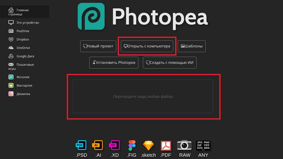 Чтобы сразу начать работу с графикой, нажмите на кнопку «Открыть с компьютера» или просто перетащите файл в рабочую область.