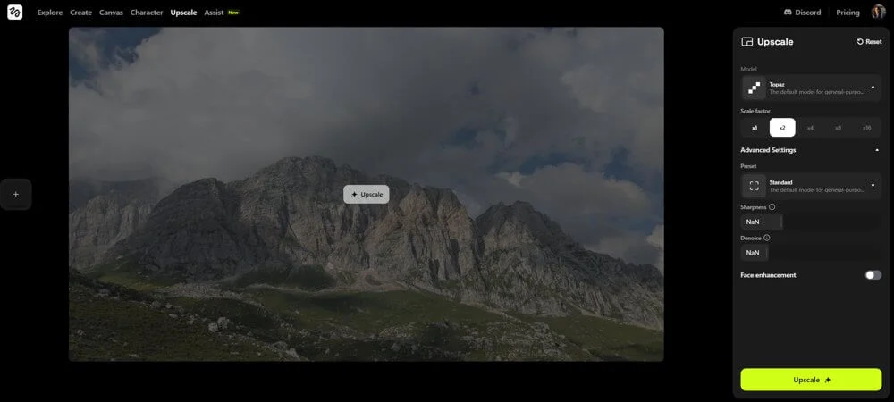 Upscale. Увеличивает качество изображения. Можно выбрать, во сколько раз улучшится картинка, модель для работы, показатель резкости и шума.