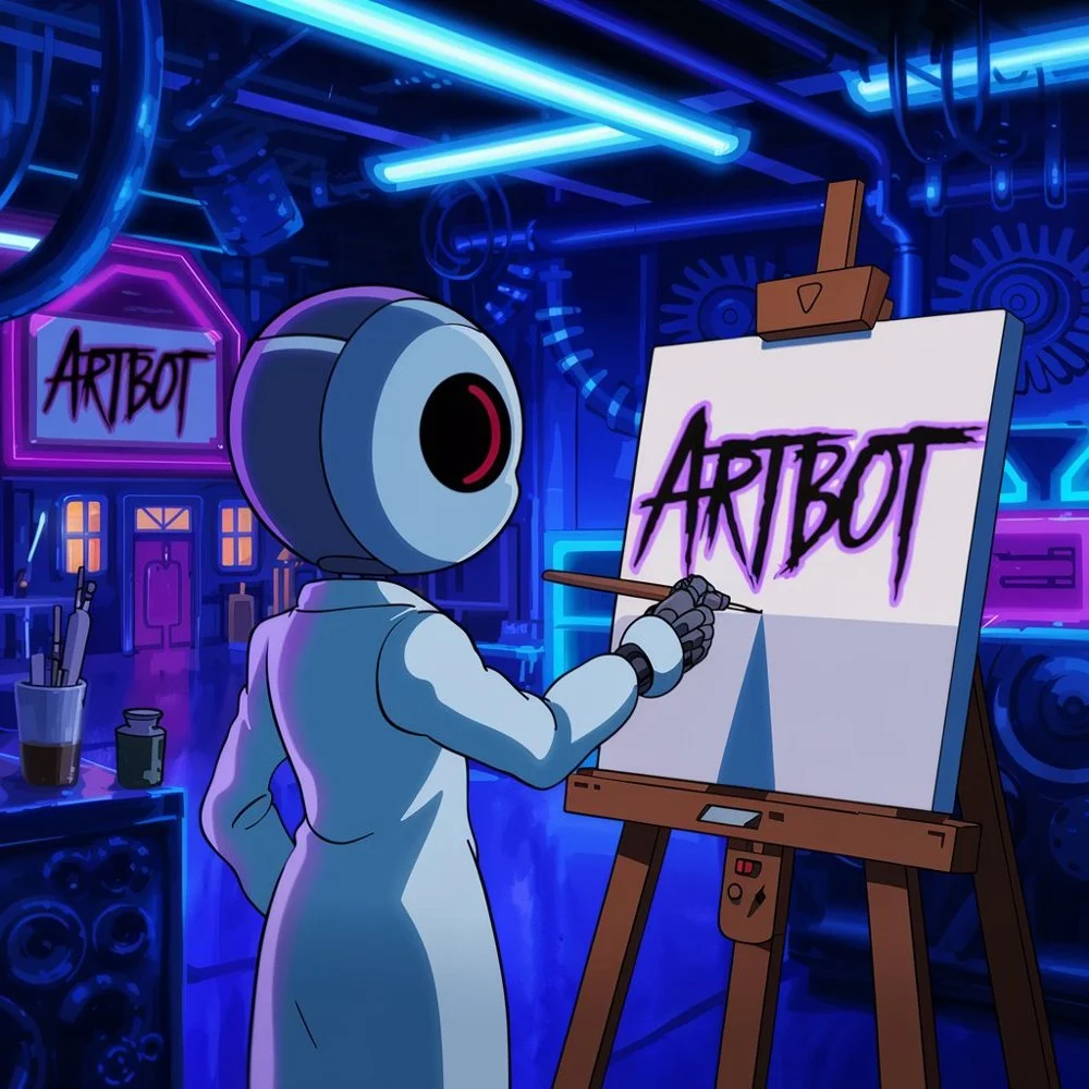 Вот пример промпта: «A robot painting a canvas in a futuristic workshop, bright neon lights, gears scattered around, cyberpunk style, bold text sharp font ‘ArtBot’ on the canvas».