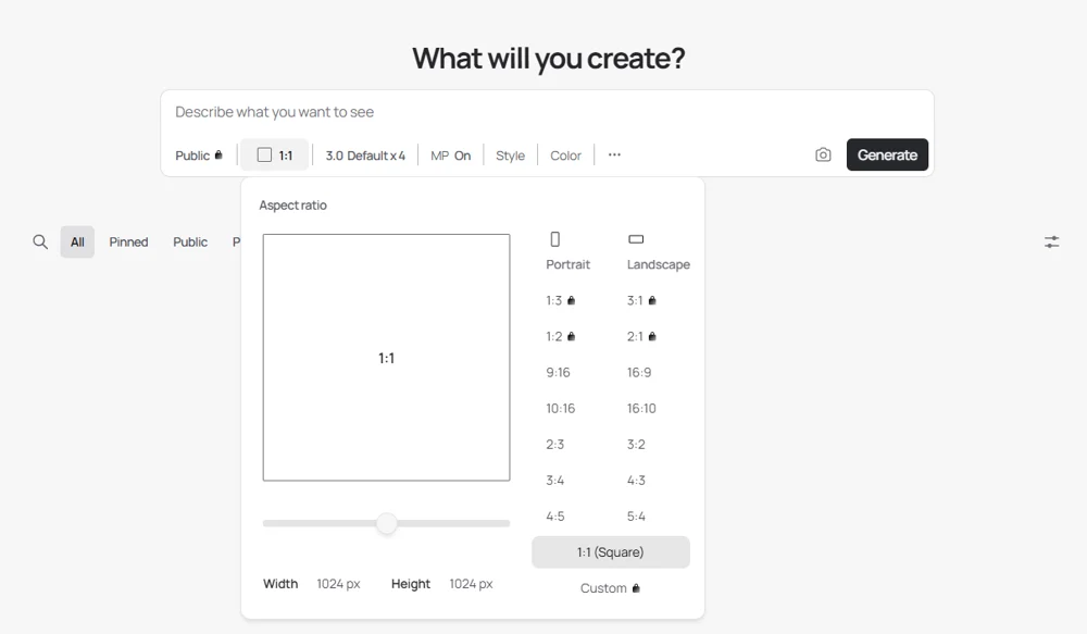 Шаг 2. Выберите соотношение сторон. То есть каким будет изображение: квадратным, горизонтальным или вертикальным. В панели генерации доступны пресеты: 1:1, 16:9, 9:16, 4:3, 3:2, 2:1 и другие. На тарифах Plus и выше можно задавать кастомные соотношения через ползунок.