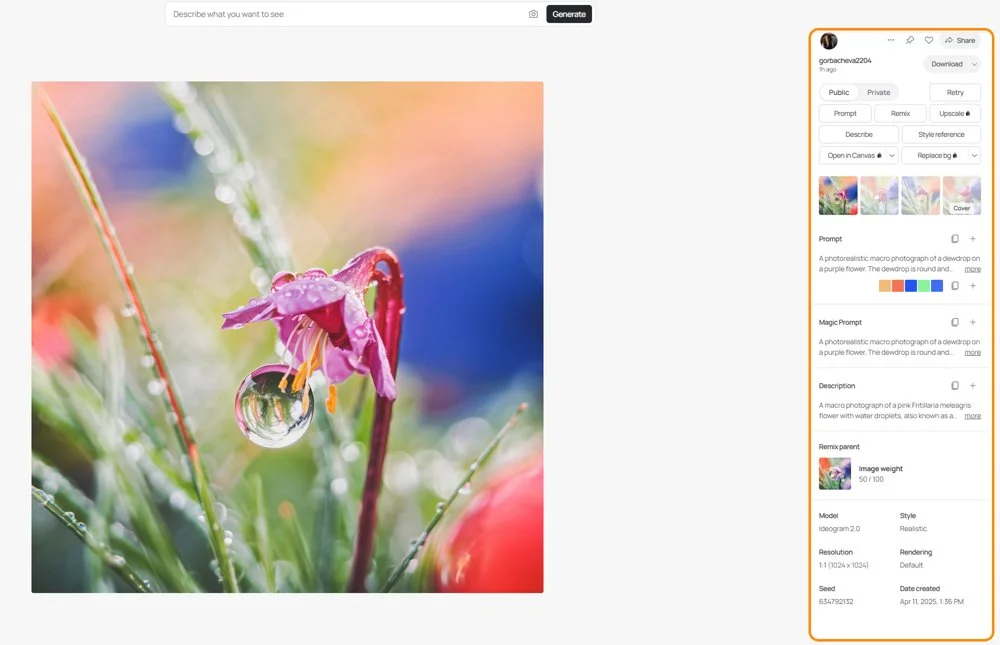 Describe image. Формулирует подробное описание к картинке в окне генерации. Описание можно использовать в качестве промпта для будущих генераций.