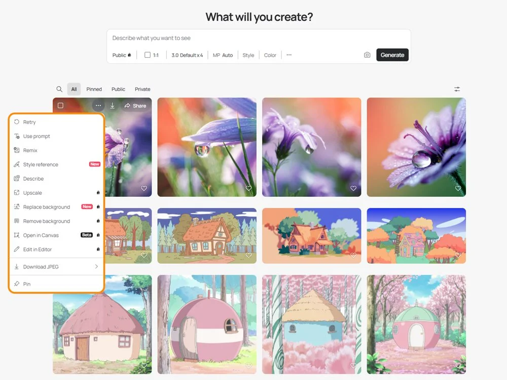 Creations. Ваши сгенерированные изображения. Есть несколько вкладок: все картинки — All, избранное — Pinned, открытые и скрытые публикации — Public и Private.