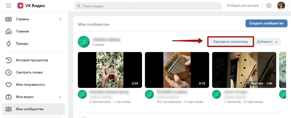 Чтобы перейти в кабинет автора, откройте «Видео», в меню слева выберите «Мои сообщества» и нажмите на кнопку «Смотреть статистику».