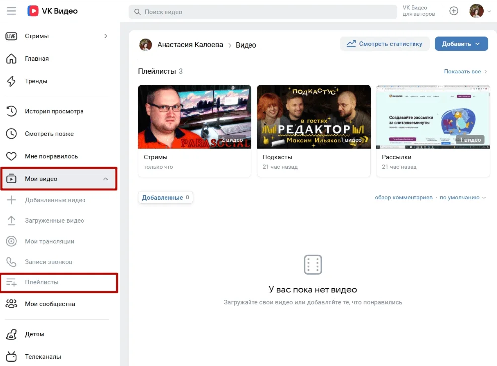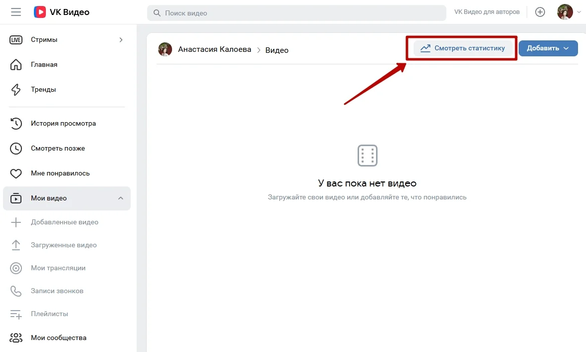 Чтобы открыть кабинет автора в профиле, откройте «Видео» и зайдите в «Мои видео». Нажмите на кнопку «Смотреть статистику» вверху справа.