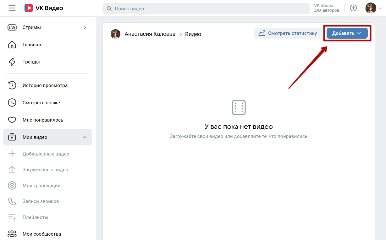 Добавить видео, начать трансляцию можно через кнопку «Добавить» в разделе «Мои видео».