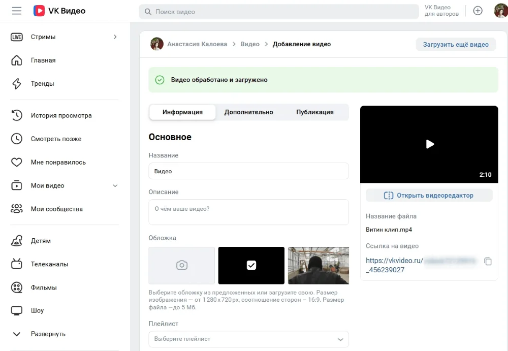 После загрузки нужно заполнить информацию о видео: название, описание, обложку. А также можно настроить приватность, время публикации и другие параметры. Если продолжительность записи меньше 1 минуты, оно будет загружено в формате клипа.