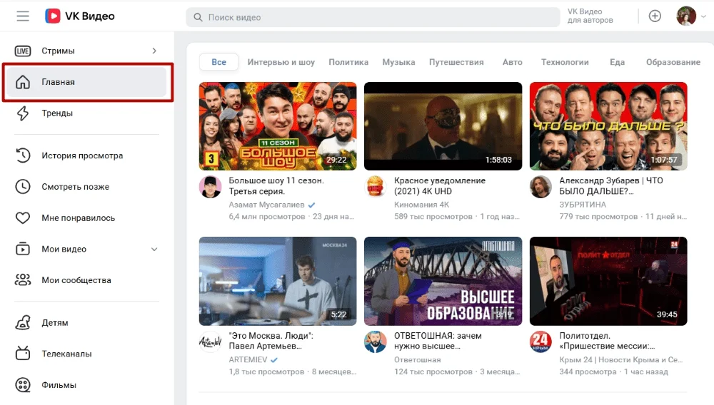 Открыть рекомендательный раздел «Главная». Здесь алгоритмы подберут видео исходя из интересов пользователя, истории поиска и подписок VK.
