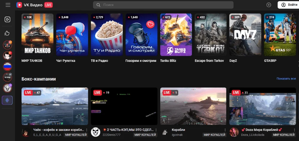 Смотреть трансляции. В разделе трансляций можно найти стримы на разные темы: от шоу и сериалов до эфиров телеканалов.