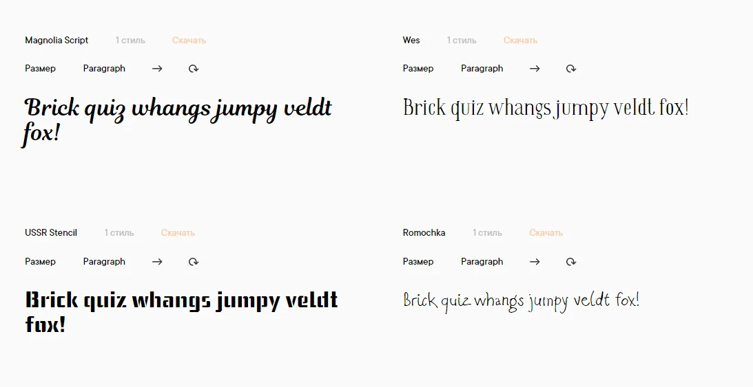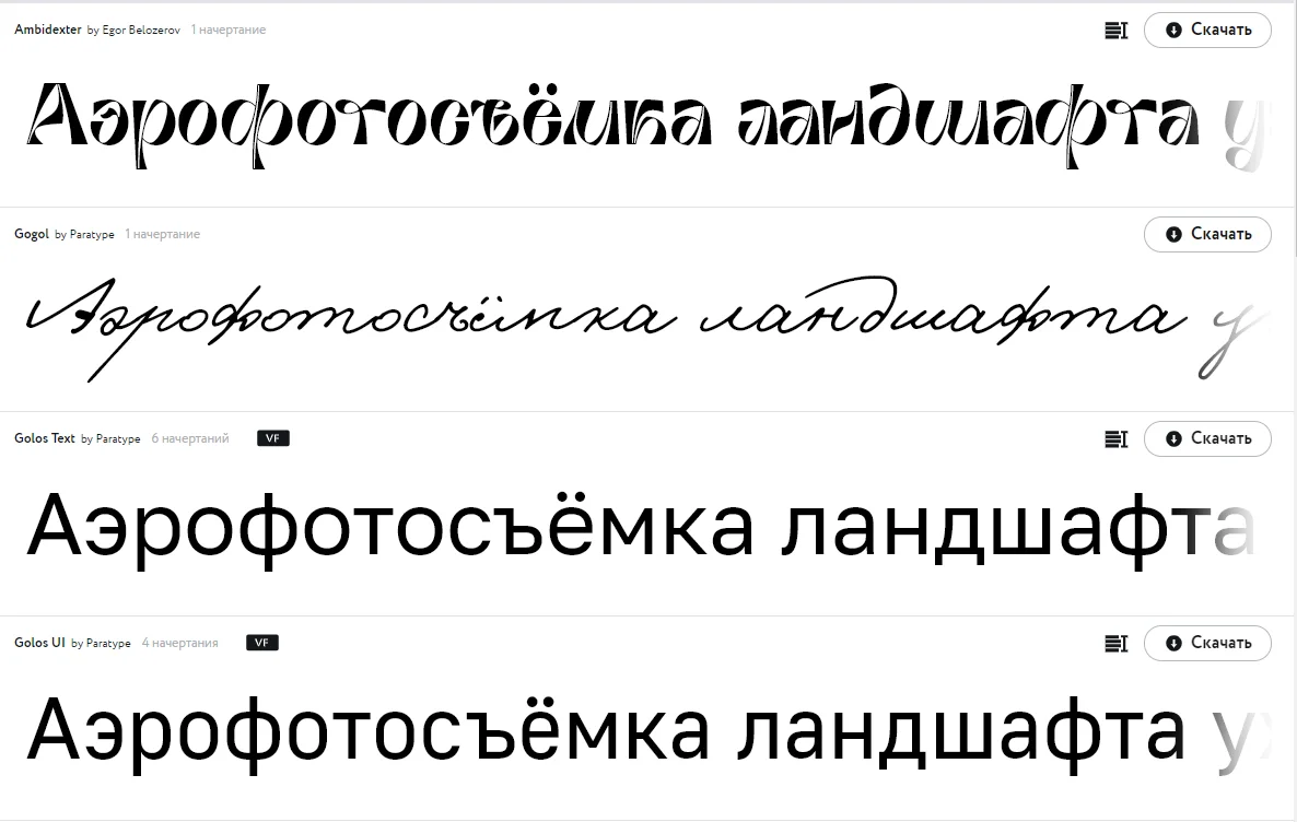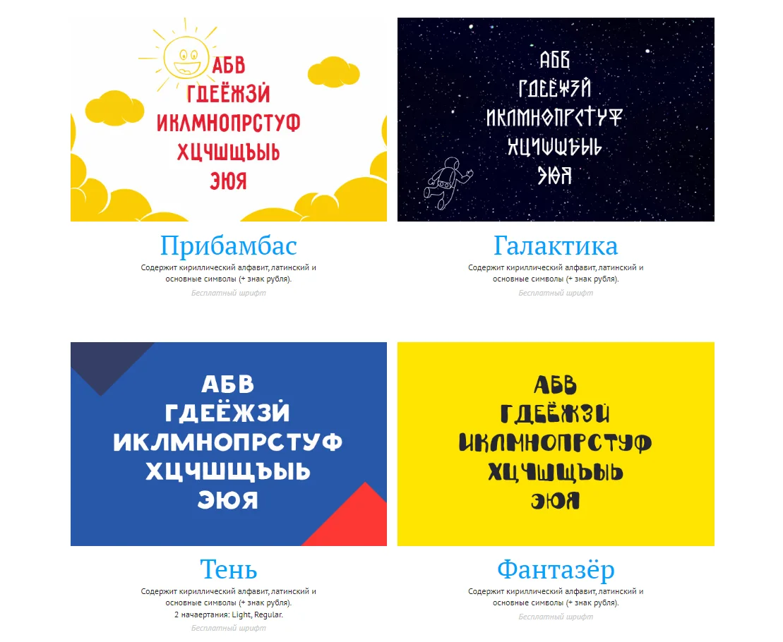 Можно ввести в поисковой строке “free font cyrillic” и выбирать — шрифтов выпадает довольно много. Большинство из них декоративные: для рекламы, логотипов или заголовков.
