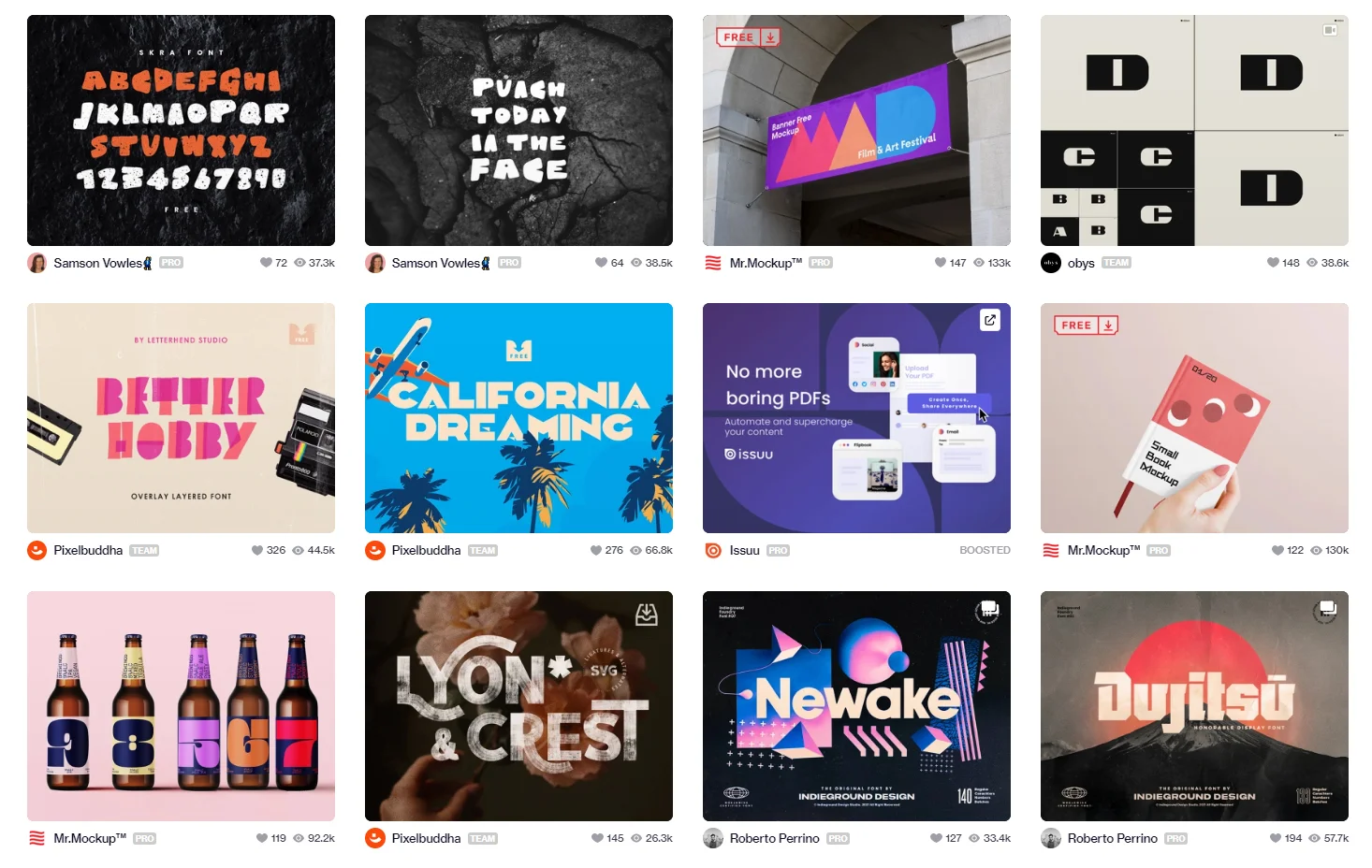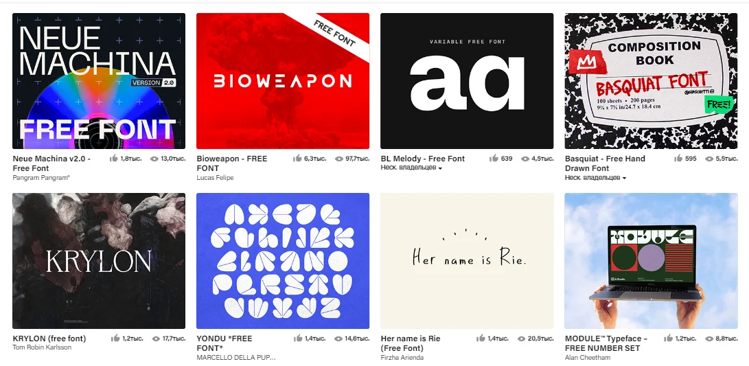 Behance — платформа, на которой дизайнеры и художники выкладывают свои портфолио. Помимо прочего, там можно найти и шрифты, которые авторы распространяют бесплатно. Обычно так делают начинающие дизайнеры, которым важно заявить о себе. Также бывают шрифты для коммерческих и некоммерческих спецпроектов, которые кто-то спонсирует, а потом их выкладывают в свободный доступ.