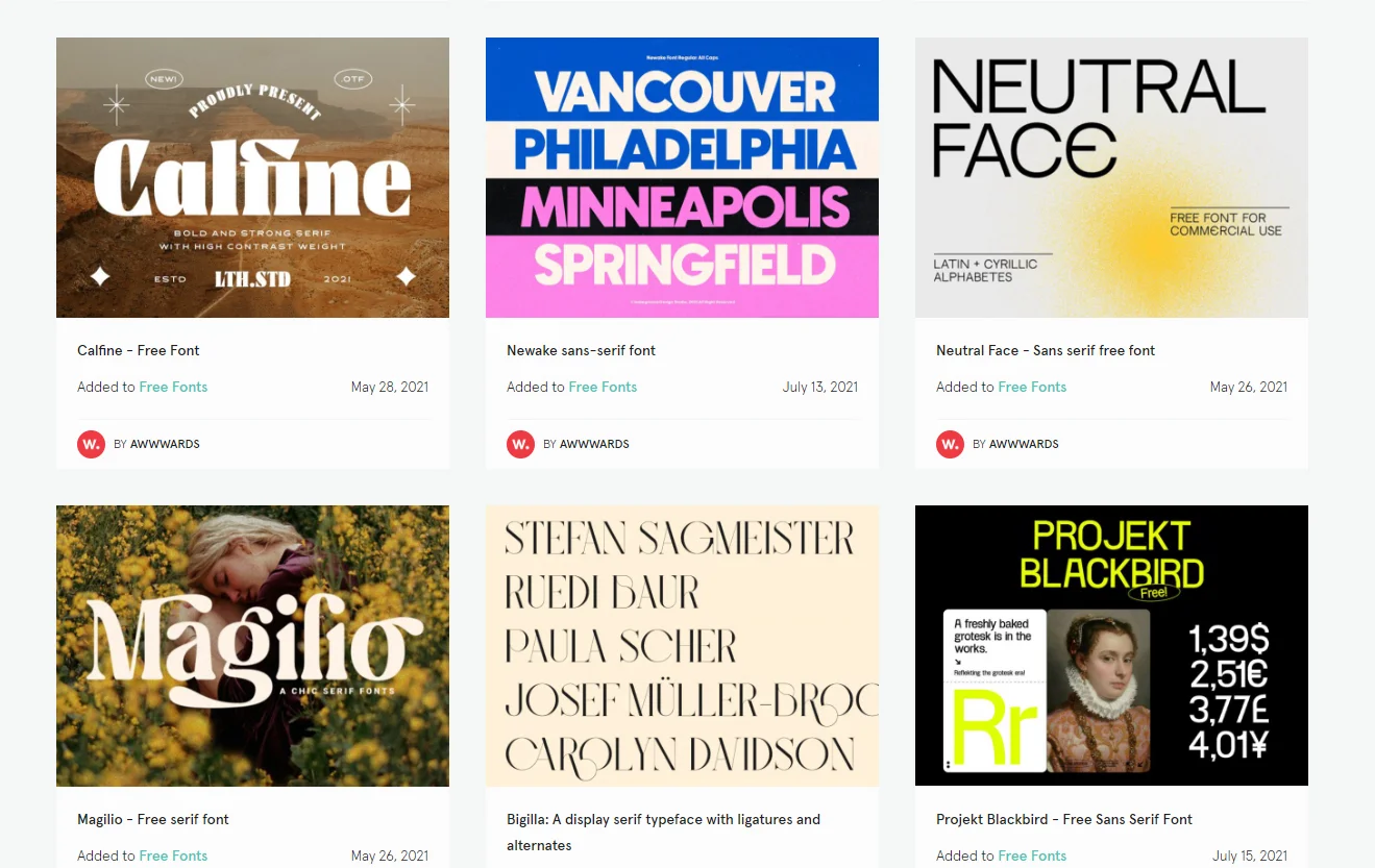 Awwwards — это сайт международной награды в области веб-дизайна. Но помимо красивых сайтов для вдохновения, здесь есть обновляемая библиотека бесплатных шрифтов — в помощь дизайнеру. Как и на Behance, в основном представлены декоративные шрифты, хотя иногда попадаются наборные. Гарнитур довольно много, правда, не все из них поддерживают русский язык, так как ресурс англоязычный. Если для вашего проекта нужна кириллица, надо дополнительно уточнять её наличие — это обычно указывают в описании.