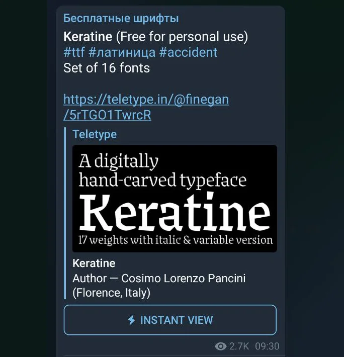 Telegram очень хорош для поиска бесплатных шрифтов: сюда оперативно выкладывают все новинки, а по тегам удобно искать то, что нужно. Один из самых крупных каналов так и называется — «Бесплатные шрифты». Здесь почти ежедневно публикуют свежие шрифты с поддержкой латиницы и кириллицы. По тегам можно отсортировать шрифты по алфавиту и по характеру: выбрать гарнитуры с засечками, без засечек или акцидентные.