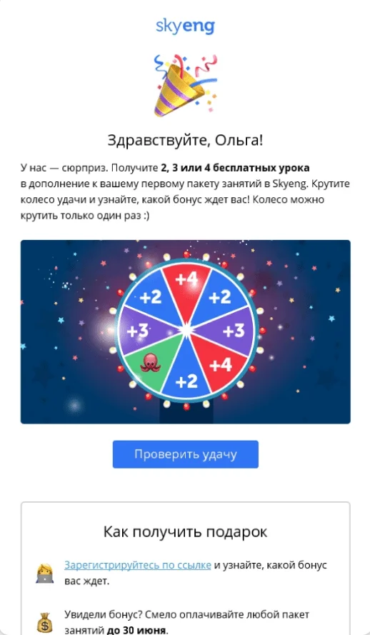 Но при всех возможных минусах геймификация — весьма эффективный инструментом в email-рассылках. Однако использовать её часто не следует. Элементы игры могут быстро надоесть аудитории и начать вызывать раздражение. Оптимальный вариант — эпизодическое применение. Например, можно создавать игровые письма с определённой периодичностью или запускать по особым поводам — праздничные даты, грандиозные события, распродажи.