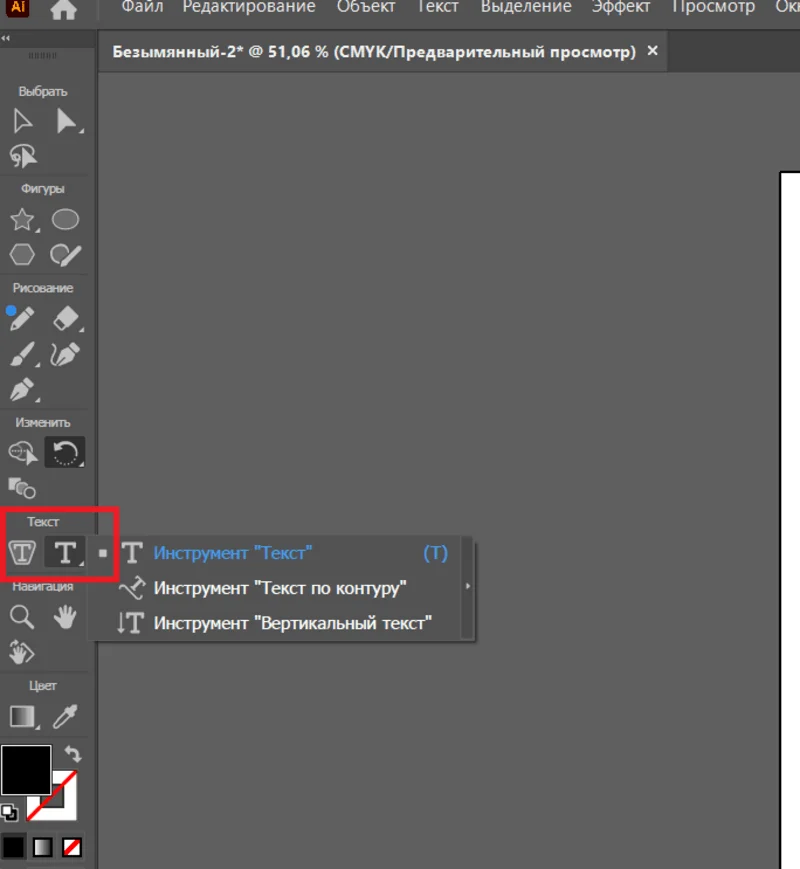 Верхнее меню — строка в верхней части окна с разделами «Файл», «Правка», «Объект», «Текст», «Выделение», «Окно» и другими. Через него выполняют ключевые команды: создание и сохранение файлов, настройку документа, трансформации, группировку объектов и управление панелями.