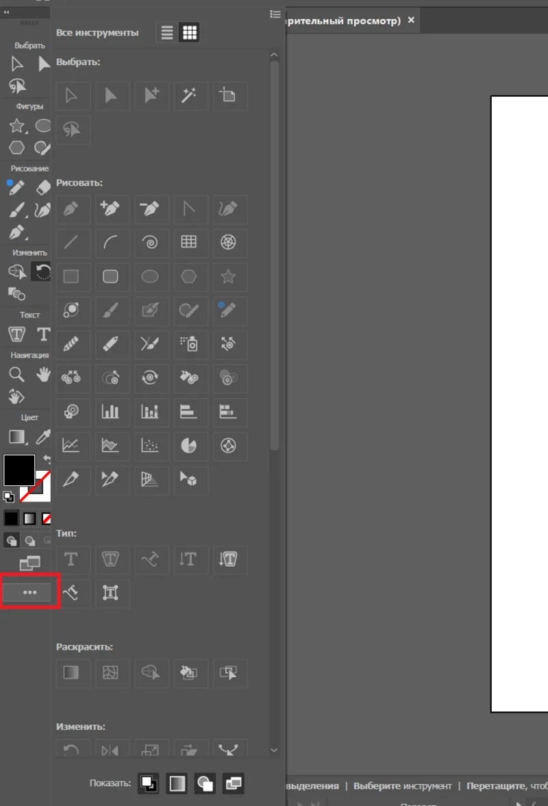 Помимо этого, можно расширить панель инструментов, нажав на иконку с тремя точками внизу. Там представлены инструменты для продвинутого использования. На старте работы с программой они вряд ли понадобятся, но тем не менее, по мере знакомства с Adobe Illustrator стоит расширять арсенал инструментов, чтобы ускорить и упростить работу.